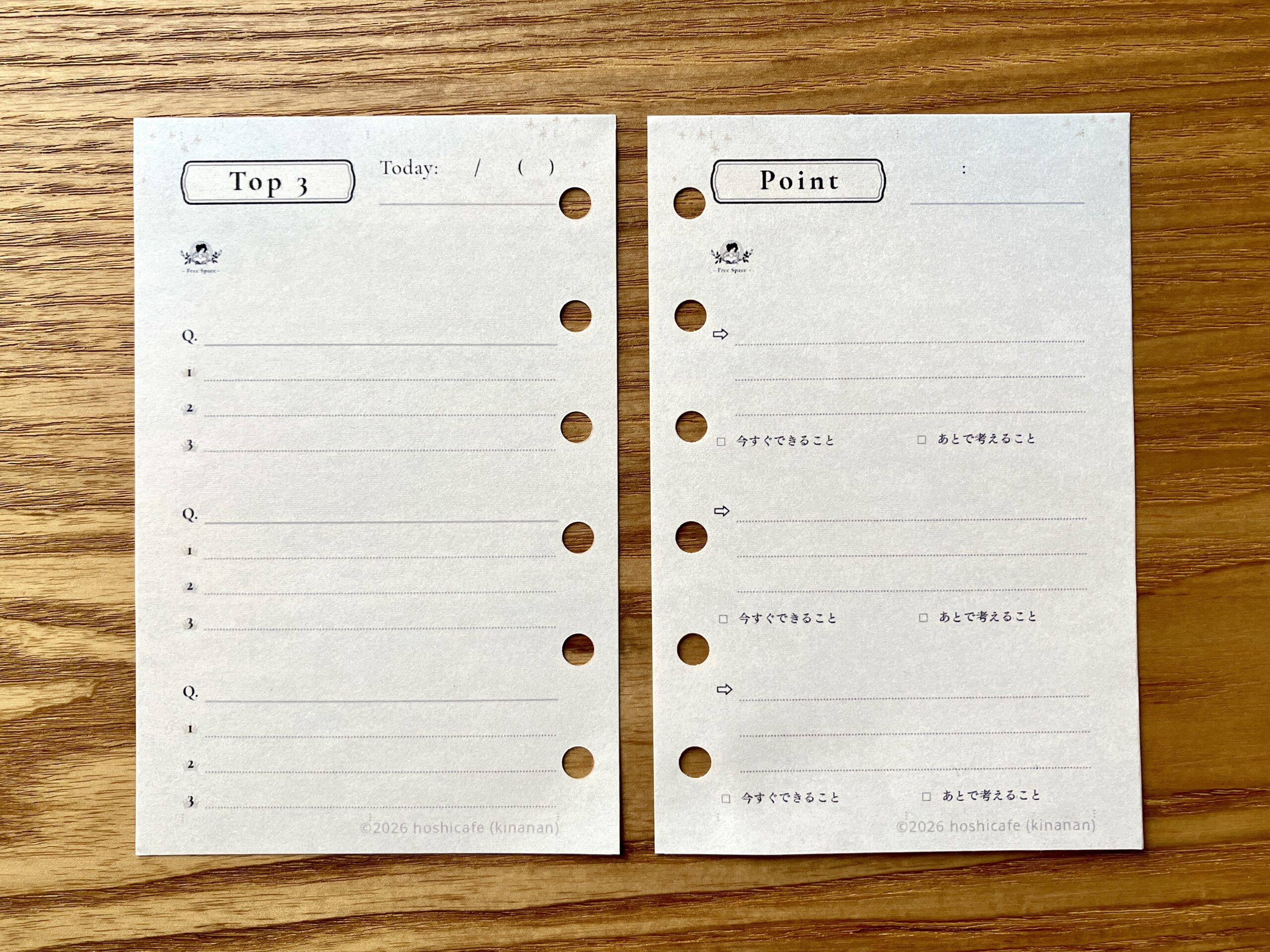 思考を整理して行動につなげる手帳リフィル「Top 3 & Point」pdfテンプレートを無料ダウンロード配布。ミニ6サイズで印刷し、穴あけした状態の実物写真。