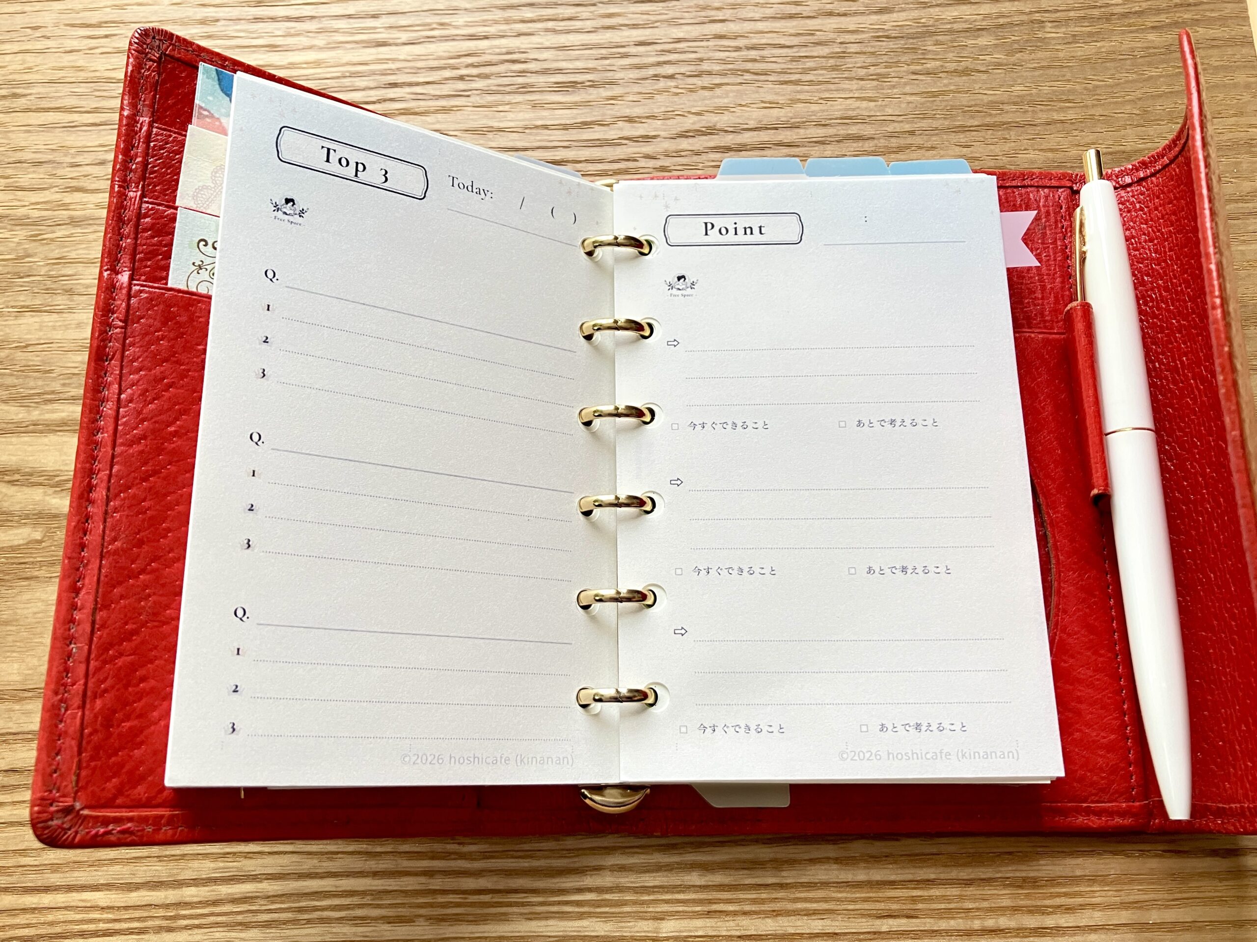 ミニ6サイズの手帳にセットした「Top 3 & Point」リフィル(かわいいpdfテンプレートを無料ダウンロード配布)の使用イメージ